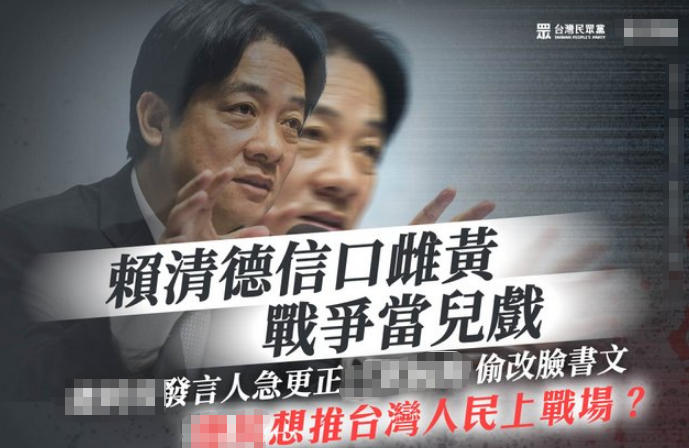 台湾民众党批评赖清德推人民上战场。(图片取自网络)