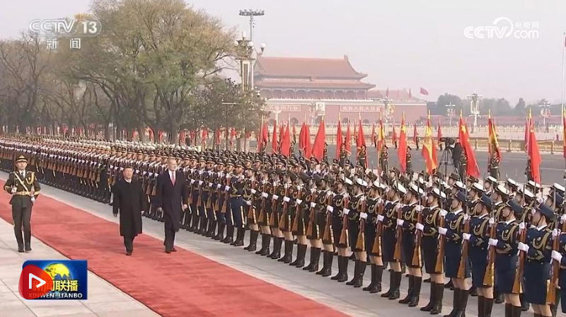 费利佩六世抵达时,礼兵列队致敬。习近平同费利佩六世登上检阅台,军乐团奏中西两国国歌,天安门广场鸣放礼炮21响。费利佩六世在习近平陪同下检阅中国人民解放军仪仗队,并观看分列式。