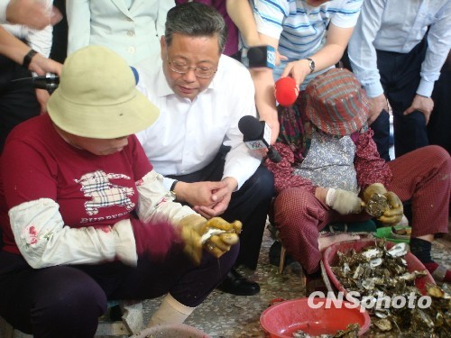 5月9日,正率团在台访问的福建省长黄小晶(中)在台南市参访路上,下车走进路边人家,与正在剥海蛎的妇女亲切交流。黄小晶5日率福建省经贸文化交流团抵台展开为期6天的“走亲访友做生意”之行。 中新社发 罗钦文 摄