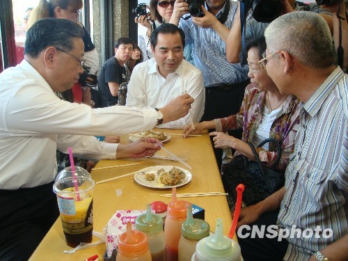 5月9日,正率团在台访问的福建省长黄小晶(左一)走进台湾台南市街头一家小吃店,邀请当地民众一起品尝台南小吃虾卷、油炸海蛎等当地小吃。图为黄小晶将一双筷子递给当地民众。 中新社发 罗钦文 摄