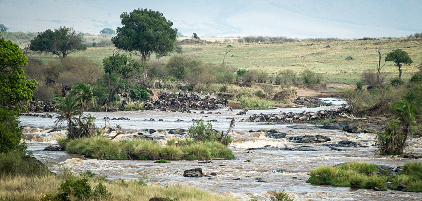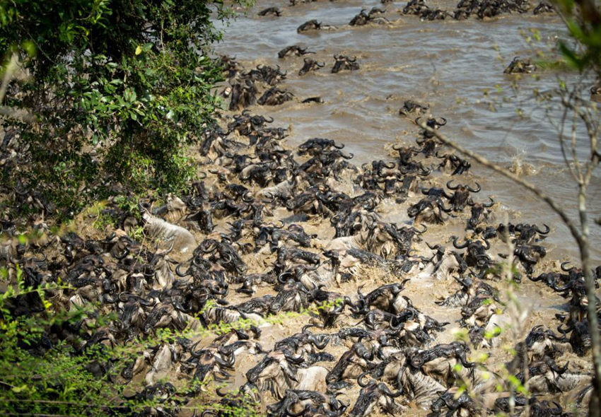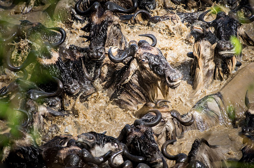 角马们成群结队地在急流中淌过。为了能够保持头部露出水面,它们需要不停地拍打水面,与湍急的河水做斗争。角马头上的犄角在河水与阳光的反射下闪闪发光,形成一道壮丽的风景线。这样的一年一度的大迁徙具有极大的危险性。只要一不留神,角马就会落入河水中,被无情的河水吞噬,而他们的尸体也就成为了鳄鱼和秃鹫的美味佳肴。即使是这样,也阻挡不了角马们迁徙的决心。
