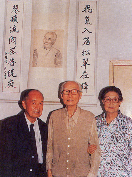 黄埔教官杜建时(中)在家中接受《黄埔》杂志原副主编林涤非的采访。右为杜建时夫人李念淑。